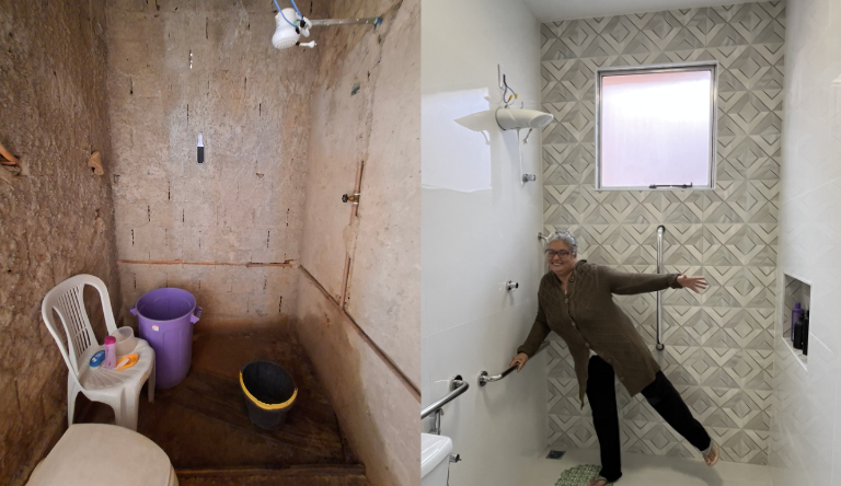 Rita também carregava esse sonho que parecia distante. A ideia de ter um banheiro como sempre quis parecia inalcançável até deixar de ser. Como ela mesma pensou: “Eu não ia poder nunca ter um banheiro assim igual eu sonhei.” Hoje, depois de participar dos cursos e ver sua realidade se transformar, ela não só conquistou esse espaço, como também vive o reconhecimento de sua trajetória. Um banheiro adaptado para a filha, que antes era necessidade, virou conquista concreta.